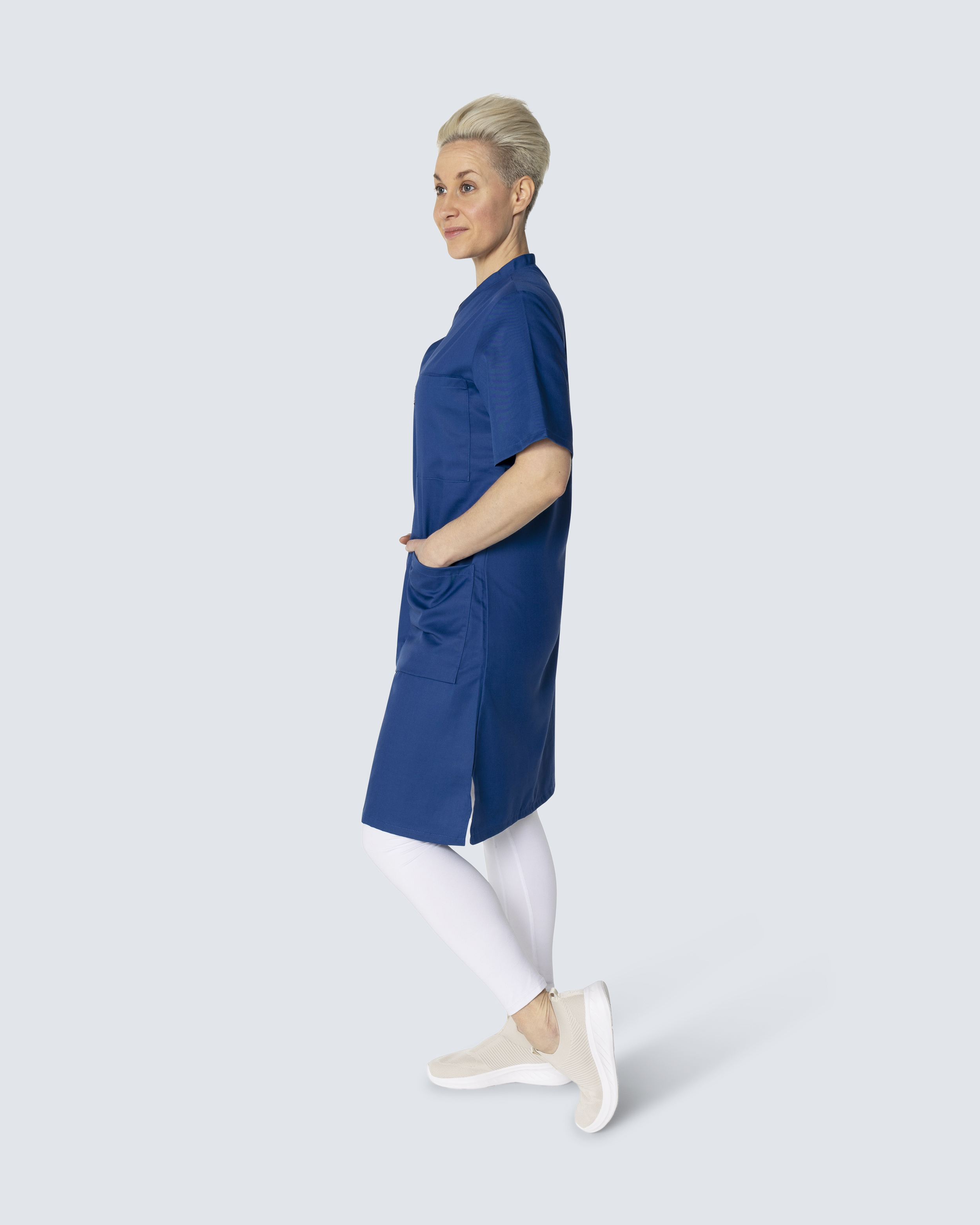 Bekväm och funktionell vårdklänning med kort ärm. Sprund i sidan för optimal rörelsefrihet. Klänningen är tillverkad i 50% Tencel, vilket ger hög andningsförmåga och luftig komfort. En bröstficka och två sidfickor med extra telefonficka och nyckelhälla. Lätt insvängd i modellen.
